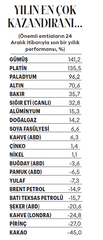 2025’te gümüş, tüm emtiaların içinde yüzde 141’lik performansla en çok kazandıran oldu. Bu, 1979’dan bu yana gümüşün en iyi yıllık performansı... Özellikle aralık ayındaki performans alışılmışın dışındaydı. Kasım sonu ons başına 50 dolar barajını, 9 Aralık’ta 60 doları aştı. Bu tarihten itibaren daha da hızlanarak 15 Aralık’ta 65 doların üzerine çıktı ve 24 Aralık’ta da 71,8 dolarla tarihi rekorlarına bir yenisini ekledi.
