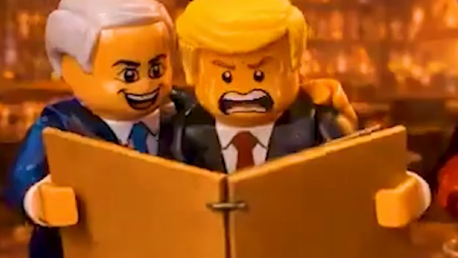 Sosyal medya platformlarında yaygın olarak paylaşılan, Binyamin Netanyahu ve Donald Trump'ın Lego karakterleriyle tasvir edildiği bir İran videosundan alınan ekran görüntüsü.