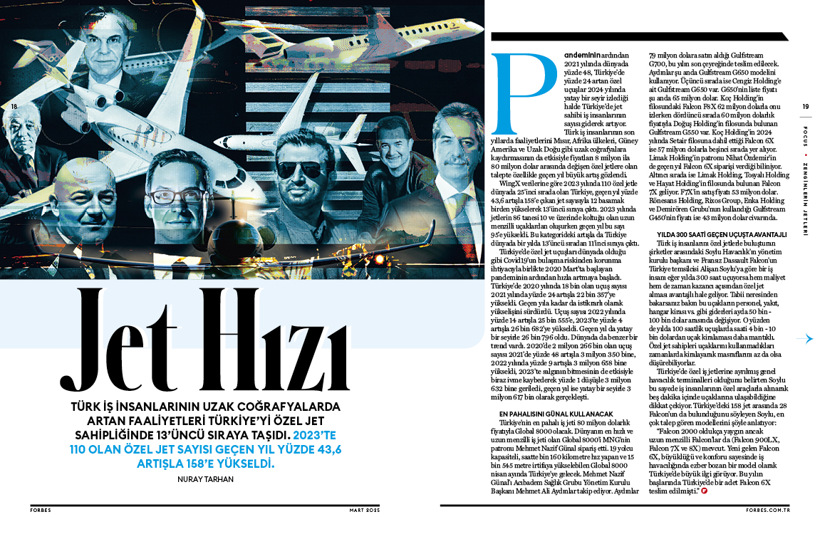 Pandeminin ardından 2021 yılında dünyada yüzde 48, Türkiye’de yüzde 24 artan özel uçuşlar 2024 yılında yatay bir seyir izlediği halde Türkiye’de jet sahibi iş insanlarının sayısı giderek artıyor. Türk iş insanlarının son yıllarda faaliyetlerini Mısır, Afrika ülkeleri, Güney Amerika ve Uzak Doğu gibi uzak coğrafyalara kaydırmasının da etkisiyle fiyatları 8 milyon ila 80 milyon dolar arasında değişen özel jetlere olan talepte özellikle geçen yıl büyük artış gözlendi.