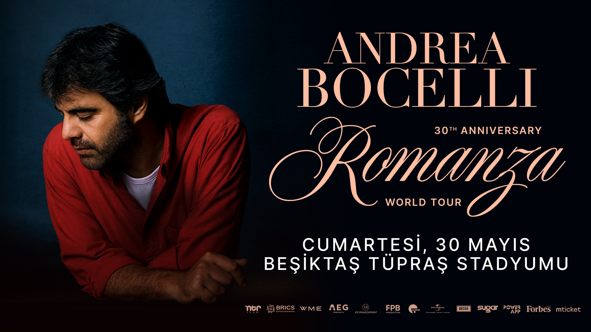 AEG Presents prodüksiyonuyla hayata geçirilen “Romanza 30th Anniversary World Tour”, Madison Square Garden’dan Hollywood Bowl’a, Venedik'teki efsanevi Piazza San Marco’dan Ernst Happel Stadyumu’na uzanan son derece prestijli bir rota izliyor. Binlerce yıllık tarihi dokusu ve çok katmanlı kültürel mirasıyla İstanbul, bu görkemli yolculuğun en seçkin duraklarından biri olarak öne çıkıyor. Şehrin dinamik enerjisi, Bocelli’nin büyüleyici sahne aurasıyla birleşerek eşine az rastlanır bir estetik şölen yaratmaya hazırlanıyor.
