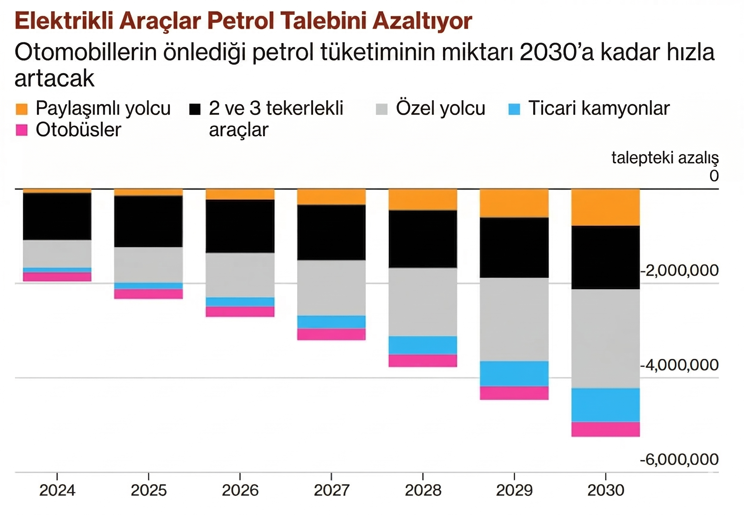 BloombergNEF tarafından hazırlanan bir modelleme senaryosuna göre, elektrikli araçların artan küresel benimsenmesi önemli bir tasarruf yarattı. Bu araçlar geçtiğimiz yıl günde 2,3 milyon varil petrol tüketimini önlemeye yardımcı oldu.